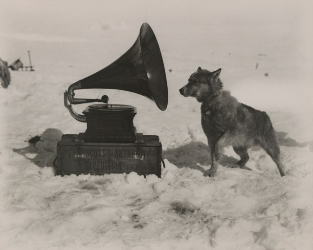 To entertain the men, Captain Robert Scott took a gramophone on his South Pole Expedition. Chris, one of his dogs, was apparently also a fan, September 1911.Photograph by Herbert G. Ponting, National Geographic