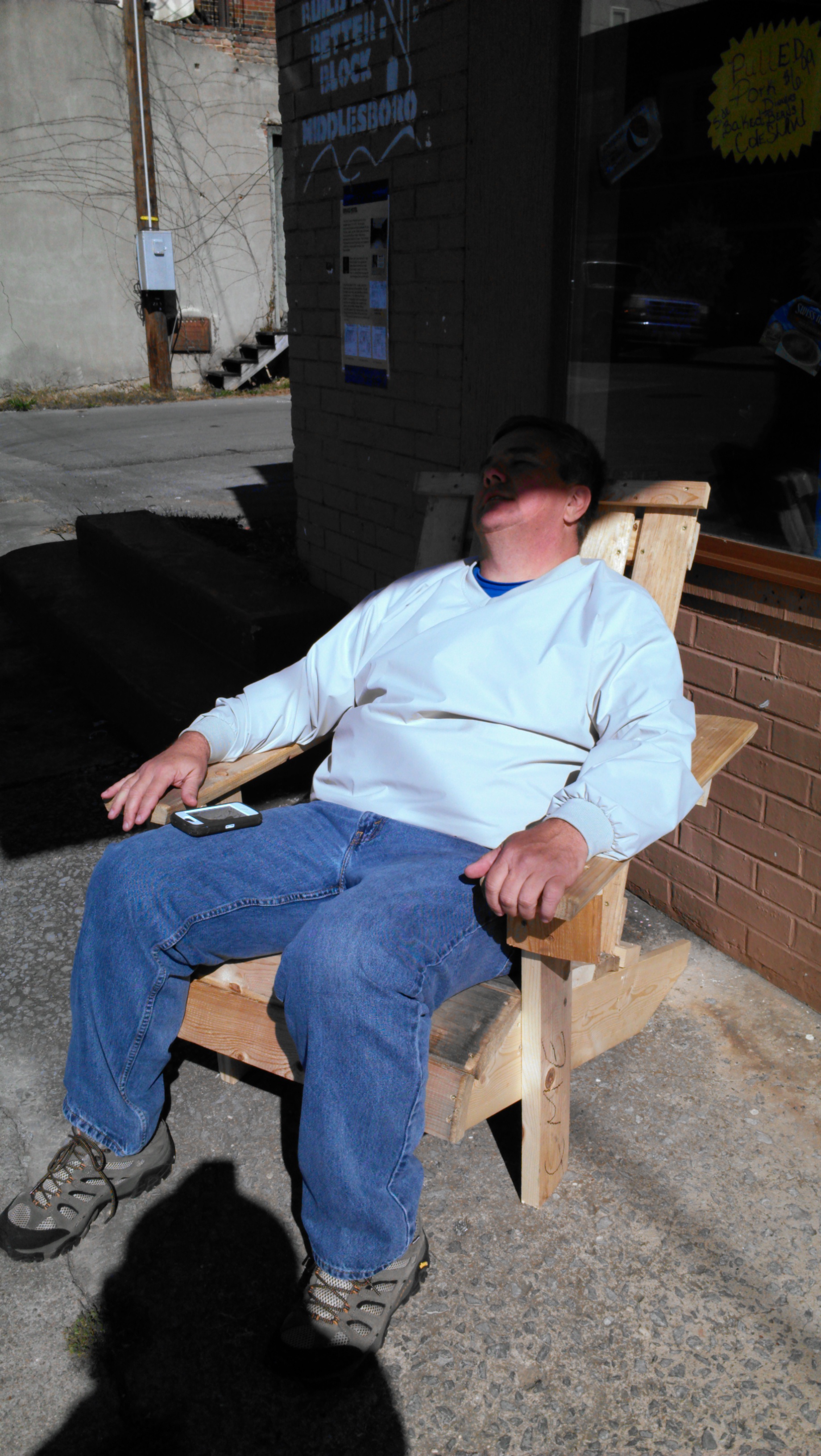 Mayor Bill Kelley takes a rest in one of the pallet chairs – outside of the pop-up restaurant he was running that day.