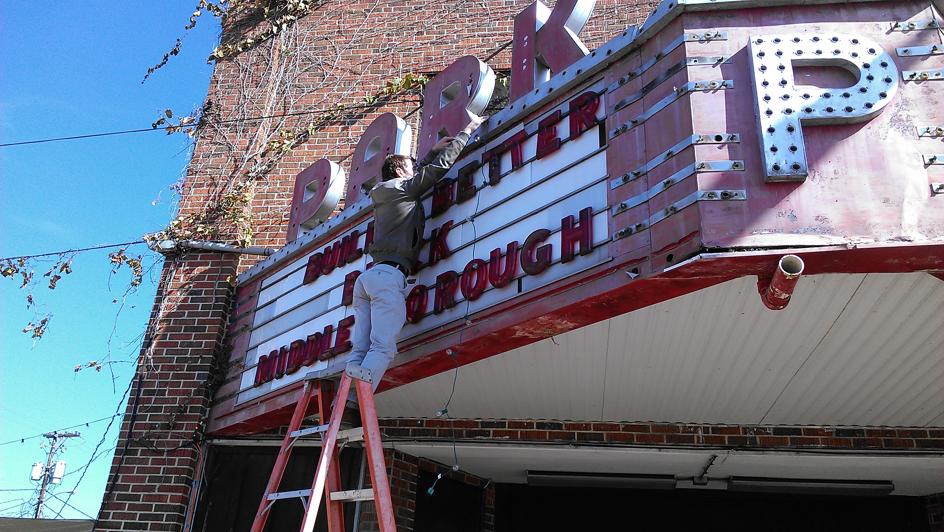 Every time I turned around, Mike Lydon was on the top of a ladder again. Having just met him that morning, I was pretty sure he was either fearless or nuts. He said that they found the letters in the abandoned theater the previous day and he had personally washed them off.